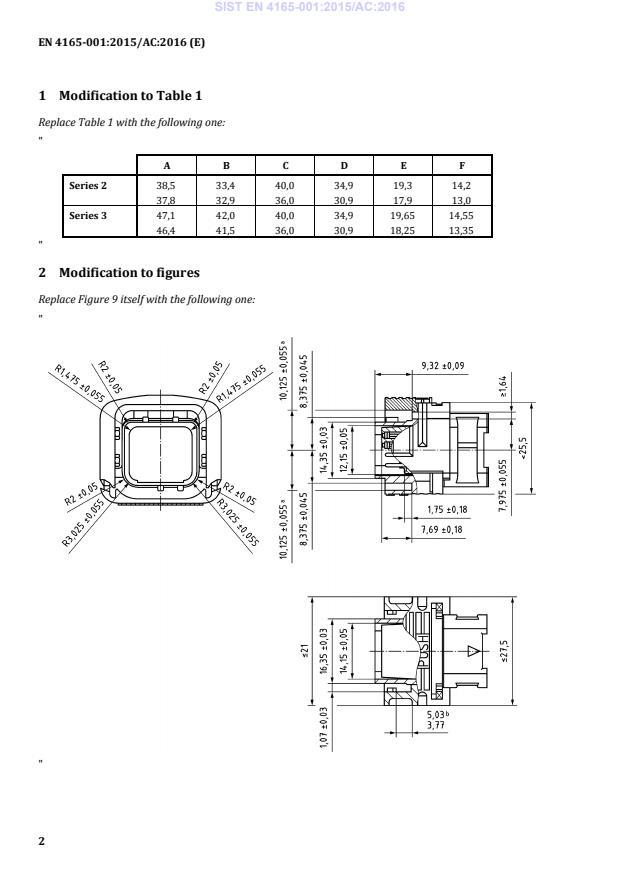 EN 4165-001:2015/AC:2016 is a corrigendum published by the European Committee for Standardization (CEN). Its full title is "Aerospace series - Connectors, electrical, rectangular, modular - Operating temperature 175 °C continuous - Part 001: Technical specification". This standard covers: Corrigendum: TC origin: replacement of several figures, modification to some keys and modification to Table 1 (SV on 2016-04-11).
