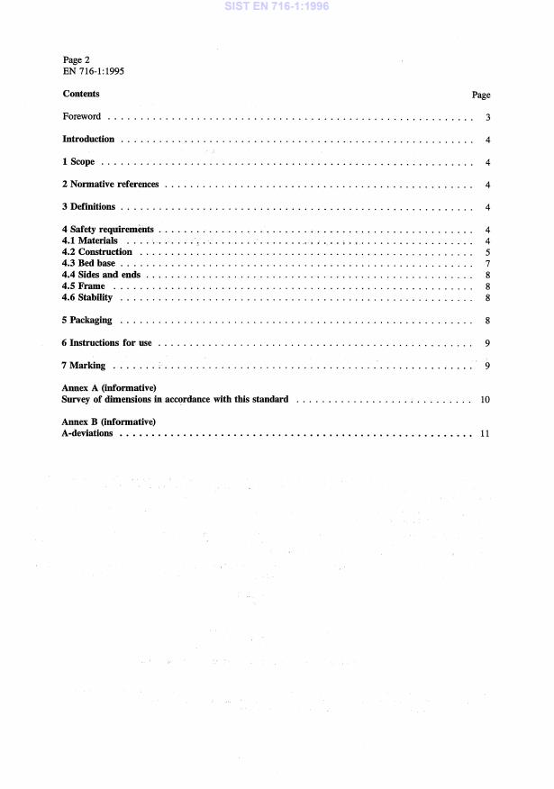 Dieser Teil der EN 716 legt Anforderungen an die Sicherheit von Kinderbetten im häuslichen Gebrauch fest. Er gilt für Betten mit einer inneren Länge zwischen 900 mm und 1400 mm. Kinderbetten mit einer Schaukel- oder Schwingfunktion fallen nicht unter den Geltungsbereich dieser Norm. Kinderbetten, die in andere Gegenstände umwandelbar sind, z.B. in Wicheltische, Kinderlaufställe Anwendungs müssen in umgebauten Zustand der jeweils für den Gegenstand gültigen Norm entsprechen. Im Anhang A (informativ)werden die Maße dieser Norm zusammengefaßt.