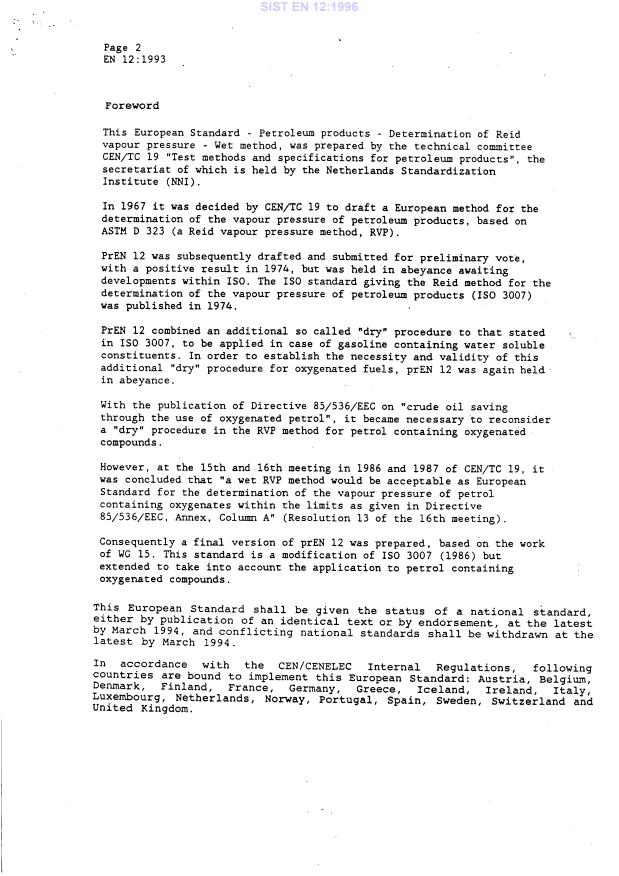 EN 12:1993 is a standard published by the European Committee for Standardization (CEN). Its full title is "Petroleum products - Determination of Reid vapour pressure - Wet method". This standard covers: This European Standard specifies a method for the determination of the absolute vapour pressure of volatile crude oil and volatile non-viscous petroleum products, with vapour pressures below 180 kPa. This method is applicable to fuels containing oxygenated compounds up to the limits stated in Annex A, column A of this standard. The method is also applicable to fuels containing up to 2,8 % m/m total oxygen, if due to ethers only.