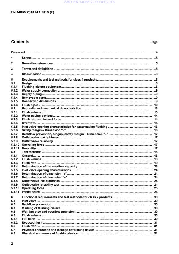 A leak is defined as being visible discharge of water amounting to more than three separate drops. !3.28 product type construction product with a set of representative performance levels or classes in relation to its Essential Characteristics, produced using a given combination of raw materials or other elements in a specific production process" 4 Classification Flushing cisterns are classified as described below: — Class 1: Flushing cisterns tested in accordance with the requirements of Clauses 5 and 8 using a nominal flush volume of either 4 l, 5 l, 6 l, 7 l or 9 l. — Class 2: Flushing cisterns tested in accordance with the requirements of Clauses 6 and 8 using a maximum flushing volume of 6 l, or a dual-flush which combines a maximum flush of 6 l and a reduced flush no greater than two-thirds of the maximum flush. — Class 3: Class 1 flushing cistern intended to be used in connection with urinals. 5 Requirements and test methods for class 1 products 5.1 Design 5.1.1 Flushing cistern equipment An equipped flushing cistern comprises: — a shell, provided with a removable lid or an access flap allowing access to components; — an inlet valve complying with EN 14124; — a flushing device; — an overflow device; — an operating mechanism; SIST EN 14055:2011+A1:2015