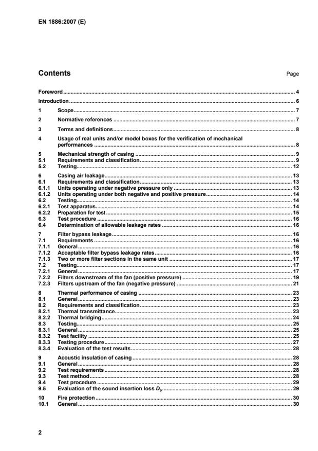EN 1886:2007 is a standard published by the European Committee for Standardization (CEN). Its full title is "Ventilation for buildings - Air handling units - Mechanical performance". This standard covers: This standard specifies test methods, test requirements and classifications for air handling units, which are supplying and/or extracting air via a ductwork ventilating/conditioning a part or the whole of the building. This standard is not applicable to the following: a) air conditioning units serving a limited area in a building, such as fan coil units; b) units for residential buildings; c) units producing ventilation air mainly for a manufacturing process. Except for the thermal and acoustic performance of the casing, the test methods and requirements are applicable to both complete units and any separate sections. The filter bypass test is not applicable to the testing of high efficiency particulate air filters (HEPA). NOTE HEPA filters are recommended to be installed downstream of the air handling unit. Such installations should be leak tested in accordance with the appropriate filter standards. The test method for the thermal performance of the casing is applicable to the comparison of different constructions, but not to the calculation of thermal losses through casing or the risk of condensation. Similarly, the test method for the acoustic performance of the casing is applicable to the comparison of different constructions, but not to the provision of accurate acoustic data for specific units.