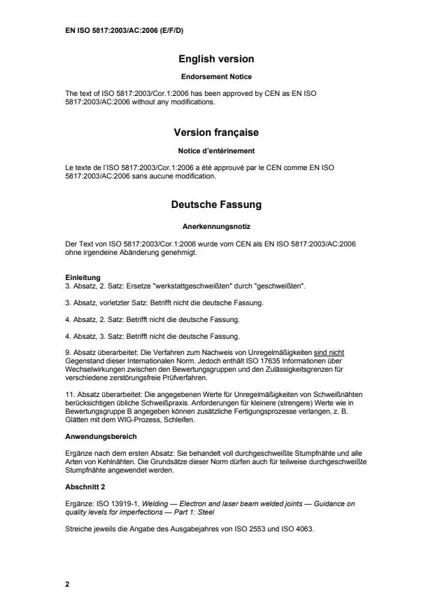 Anerkennungsnotiz Der Text von ISO 5817:2003/Cor.1:2006 wurde vom CEN als EN ISO 5817:2003/AC:2006 ohne irgendeine Abänderung genehmigt.