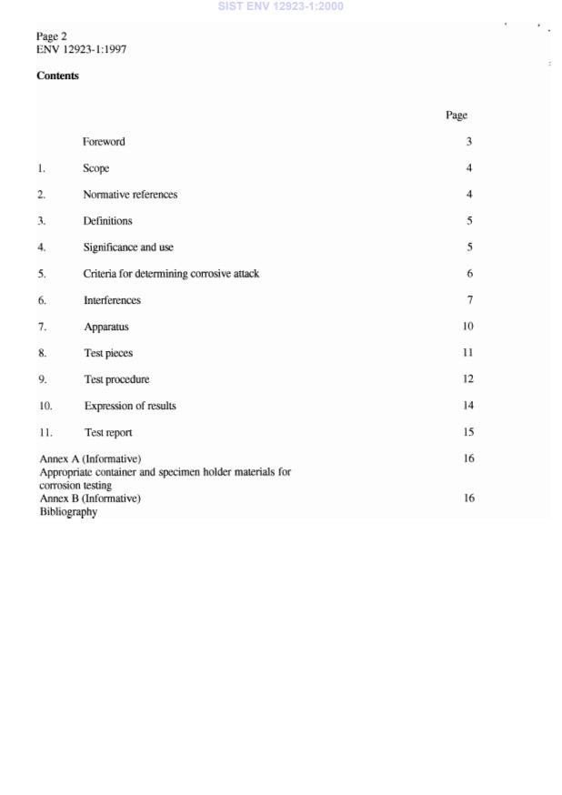 Dieser Teil von ENV 12923 beschreibt den allgemeinen Verfahrensablauf bei der Durchführung von Korrosionsprüfungen an Hochleistungskeramik. Die Mechanismen des chemischen Angriffs auf Hochleistungskeramik sind vielfältig, und sie hängen von der chemischen Zusammensetzung, der Phasenzusammensetzung und der Phasenmorphologie des Werkstoffs und ebenso von den Korrosionsbedingungen ab, denen sie ausgesetzt ist. Für jede einzelne technische Anwendung müssen die zu erwartenden Einsatzbedingungen üblicherweise modelliert werden, usw.