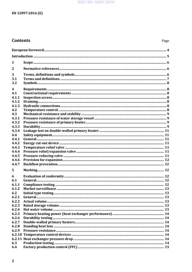 EN 12897:2016 is a standard published by the European Committee for Standardization (CEN). Its full title is "Water supply - Specification for indirectly heated unvented (closed) storage water heaters". This standard covers: This European Standard specifies the constructional and performance requirements and methods of test for indirectly heated, unvented (closed) storage water heaters of up to 2 000 l volume suitable for connection to a water supply at a pressure between 0,05 MPa and 1,0 MPa (0,5 bar and 10 bar), and fitted with control and safety devices designed to prevent the temperature of the stored drinking water from reaching 95 °C. Whilst storage water heaters intended primarily for direct heating are not covered by this standard, it does allow the provision of electric heating elements for auxiliary use.