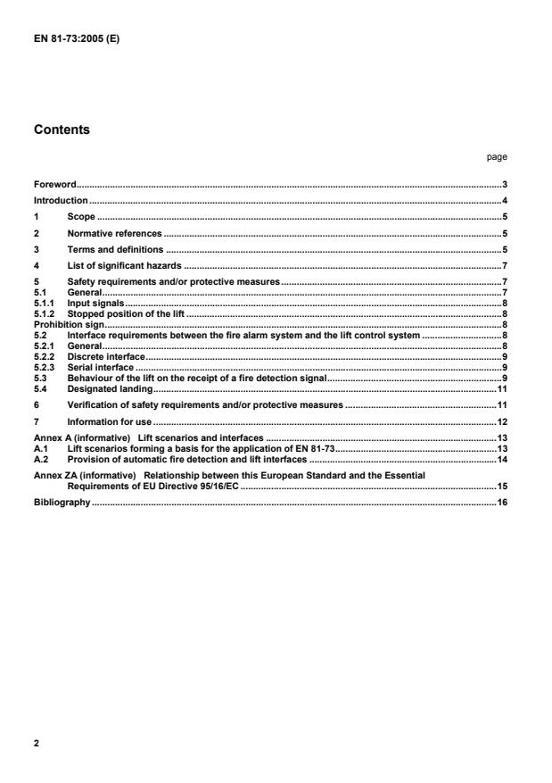 EN 81-73:2005 is a standard published by the European Committee for Standardization (CEN). Its full title is "Safety rules for the construction and installation of lifts - Particular applications for passenger and goods passenger lifts - Part 73: Behaviour of lifts in the event of fire". This standard covers: This European Standard specifies the special provisions and safety rules to ensure the behaviour of lifts in the event of fire in a building, on the basis of a signal(s) from the fire alarm detection system to the lift(s) control system. It applies to new passenger lifts and goods passenger lifts. However, it may be used as a basis to improve the safety of existing passenger and goods passenger lifts. This standard gives various options for control of the lift in the event of a fire in a building. This standard does not apply to: ¾ lifts which remain in use in the event of fire e.g. firefighters' lifts as defined in EN 81-72:2003; ¾ the use of lifts for the evacuation of a building and ¾ a fire in the well.