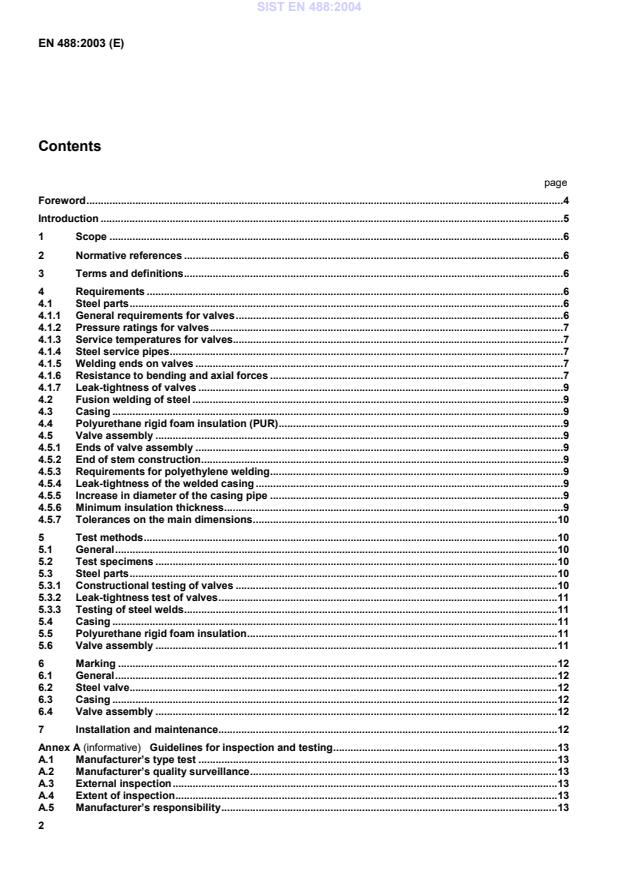 EN 488:2003 is a standard published by the European Committee for Standardization (CEN). Its full title is "District heating pipes - Preinsulated bonded pipe systems for directly buried hot water networks - Steel valve assembly for steel service pipes, polyurethane thermal insulation and outer casing of polyethylene". This standard covers: This European Standard specifies requirements and test methods for valves of prefabricated thermally insulated valve assemblies comprising a steel valve, rigid polyurethane foam insulation and an outer casing of polyethylene for use in directly buried hot water networks with preinsulated pipe assemblies in accordance with prEN 253. This standard applies only to insulated valve assemblies for continuous operation with hot water at various temperatures in accordance with clause 1 of prEN 253:2002. Guidelines for quality inspection are given in annex A of this standard. Guidelines for installation of valves are given in annex B of this standard. NOTE For this application the following valve types are commonly used: Ball valves, gate valves, and butterfly valves. NOTE This standard does not include rules for calculation of loads and stresses.