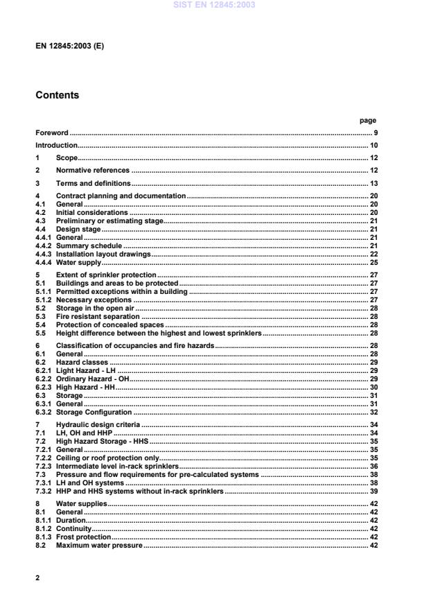 EN 12845:2003 is a standard published by the European Committee for Standardization (CEN). Its full title is "Fixed firefighting systems - Automatic sprinkler systems - Design, installation and maintenance". This standard covers: This standard specifies requirements and gives recommendations for the design, installation and maintenance of fixed fire sprinkler systems in buildings and industrial plant, and particular requirements for sprinkler systems, which are integral to measures for the protection of life. This standard covers only the types of sprinkler specified in EN 12259-1 (see annex L). The requirements and recommendations of this standard are also applicable to any addition, extension, repair or other modification to a sprinkler system. They are not applicable to water spray or deluge systems. It covers the classification of hazards, provision of water supplies, components to be used, installation and testing of the system, maintenance, and the extension of existing systems, and identifies construction details of buildings which are the minimum necessary for satisfactory performance of sprinkler systems complying with this standard. This standard does not cover water supplies to systems other than sprinklers. Its requirements can be used as guidance for other fixed fire fighting extinguishing systems, however, provided that any specific requirements for other fire fighting extinguishing supplies are taken into account. This standard also covers sprinkler system kits. The requirements are not valid for automatic sprinkler systems on ships, in aircraft, on vehicles and mobile fire appliances or for below ground systems in the mining industry.