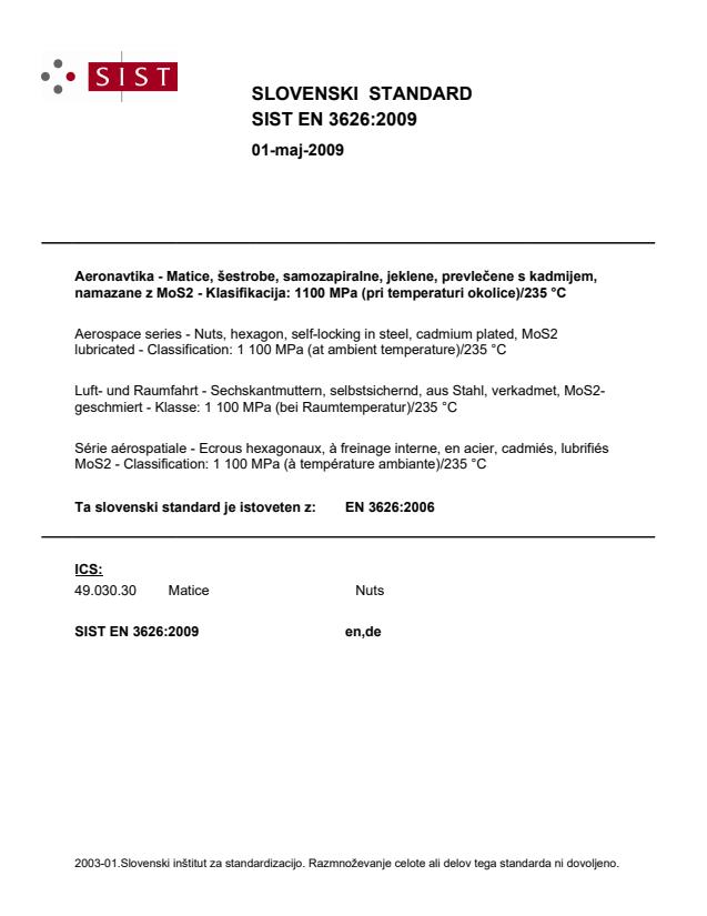 EN 3626:2006 is a standard published by the European Committee for Standardization (CEN). Its full title is "Aerospace series - Nuts, hexagon, self-locking in steel, cadmium plated, MoS2 lubricated - Classification: 1 100 MPa (at ambient temperature)/235 °C". This standard covers: This standard specifies characteristics of self-locking hexagonal nuts, with flange, in steel, cadmium plated, MoS2 lubricated. Classification: 1 100 MPa ) / 235 °C ).