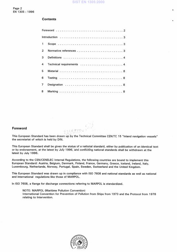EN 1305:1996 is a standard published by the European Committee for Standardization (CEN). Its full title is "Inland navigation vessels - Connections for the discharge of oily mixture". This standard covers: This European Standard specifies design, dimensions, technical requirements and testing of connections for the discharge of oily mixture from inland navigation vessels. It does not apply to the disposal of residues from cargo tanks. The Standard specifies: - a connection of a design that is common on inland navigation vessels consisting of a threaded pipe and a quick release coupling; - a connection for vessels with a flange ISO 7608-A1 consisting of a fitting flange with welded threaded pipe and quick release coupling.