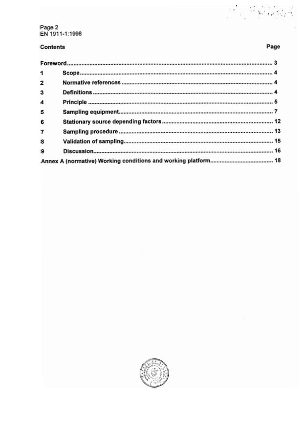 EN 1911-1:1998 is a standard published by the European Committee for Standardization (CEN). Its full title is "Stationary source emissions - Manual method of determination of HCl - Part 1: Sampling of gases". This standard covers: This standard specifies a method for sampling and filtration of gases, in view of their HCl concentration determination. Subsequent HCl absorption and analysis are described in prEN 1911-2 and prEN 1911-3 respectively. The method applies to ducted gaseous streams emitted by waste incinerators, and more generally to waste gases in which HCl concentration may vary between 1 mg. m-3 and 5000 mg.m-3 under normal pressure and temperature conditions. The method is validated for gaseous streams of dust concentration below 100 mg.m-3, and is not suitable for measurement of molecular chlorine Cl2 content.