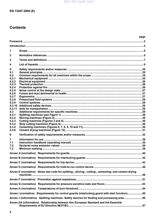 EN 13457:2004 is a standard published by the European Committee for Standardization (CEN). Its full title is "Footwear, leather and imitation leather goods manufacturing machines - Splitting, skiving, cutting, cementing and cement drying machines - Safety requirements". This standard covers: 1.1 This European Standard applies to splitting, skiving, edge trimming, strip cutting, cementing and cement drying machines used in the manufacture of footwear, leather and imitation leather goods and other related components. 1.2 This European Standard does not apply to: - trimming machines with rotary milling tool for the purpose of trimming edges of material see EN 930:1996; - splitting and band knife machines used in tanneries see prEN 13112:1997; - portable machines. 1.3 This European Standard specifies safety requirements for construction, transport, installation, adjustment, setting, teaching or process change-over, operation, cleaning, maintenance, decommissioning, dismantling and, as far as safety is concerned, disposal for machines mentioned in 1.1. It takes account of intended use, component and system failure. 1.4 This European Standard deals with significant hazards relevant to the footwear, leather and imitation leather goods manufacturing industries. (For a List of hazards see clause 4.) The European Standard does not deal with precise technical measures for reducing the risks of fumes and dusts detrimental to health. The use of machines falling within the scope of this Standard for purposes other than those specified in 1.1, may give rise to hazards not considered during its preparation. 1.5 This European Standard also applies to equipment for material handling and operations which are an integral part of the machine. 1.6 This European Standard assumes the machines - are operated by adequately trained persons - are used with adequate workplace lighting conforming the local regulations or to prEN 12464:1998