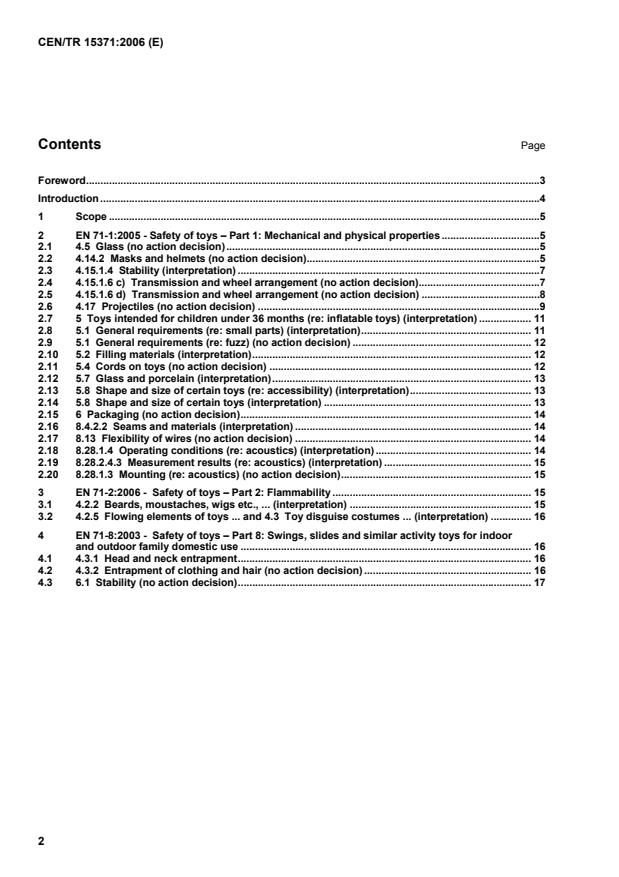 CEN/TR 15371:2006 is a technical report published by the European Committee for Standardization (CEN). Its full title is "Safety of toys - Replies to requests for interpretation of EN 71-1, EN 71-2, and EN 71-8". This standard covers: The purpose of this CEN Technical Report is to provide replies to requests for interpretations of EN 71-1:2005, Safety of toys - Part 1: Mechanical and physical properties (under publication), EN 71-2:2006, Safety of toys - Part 2: Flammability, EN 71-8:2003, Safety of toys - Part 8: Swings, slides and similar activity toys for indoor and outdoor family domestic use. NOTE The clause references to EN 71-1 are to the 2005-edition. If the clause number is different from the 1998-edition, the clause number of EN 71-1:1998 is also indicated. The clause references to EN 71-2 are to the 2006-edition. If the clause number is different from the 2003-edition, the clause number of EN 71-2:2003 is also indicated.