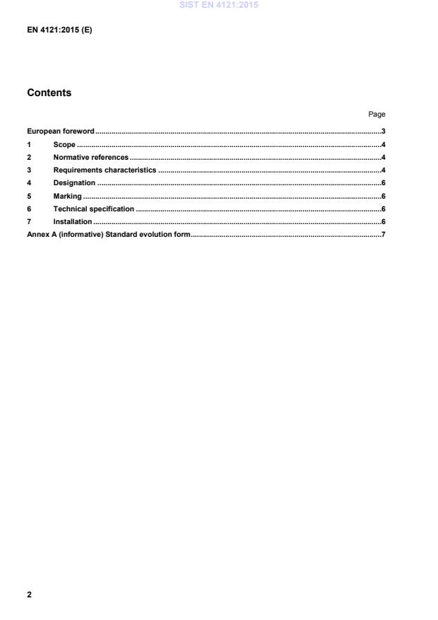 Page European foreword .3 1 Scope .4 2 Normative references .4 3 Requirements characteristics .4 4 Designation .6 5 Marking .6 6 Technical specification .6 7 Installation .6 Annex A (informative) Standard evolution form .7