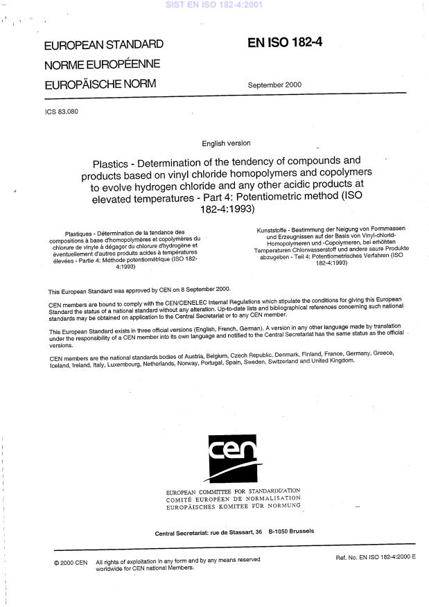 EN ISO 182-4:2000 is a standard published by the European Committee for Standardization (CEN). Its full title is "Plastics - Determination of the tendency of compounds and products based on vinyl chloride homopolymers and copolymers to evolve hydrogen chloride and any other acidic products at elevated temperatures - Part 4: Potentiometric method (ISO 182-4:1993)". This standard covers: The principle of the method is maintaining a test portion of the PVC at an agreed temperature in a nitrogen gas stream, absorbing the hydrogen chloride evolved in a given amount of an appropriate solution, and potentiometrically determining the amount of hydrogen chloride evolved in relation to the recorded change in pCl of the absorbing solution. The method is recommended for compounded PVC materials and products only, although it can be used for polymers in powder form under appropriate conditions.
