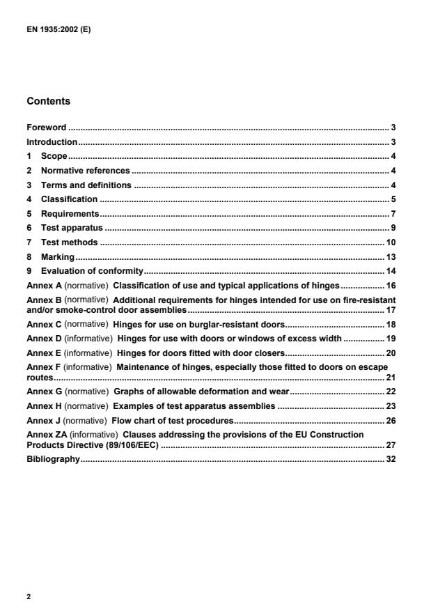 EN 1935:2002 is a standard published by the European Committee for Standardization (CEN). Its full title is "Building hardware - Single-axis hinges - Requirements and test methods". This standard covers: This European Standard specifies requirements for single-axis hinges, of lift-off or fixed pin type, for use on access windows and doors. Such windows and doors may or may not be fitted also with door closing devices. It includes tests for static loads, shear strength and allowable wear during durability cycling for the following hinges: a)mounted on the edge of the door leaf or window sash and opening in one direction only; b)whose axis of rotation is within 30 mm of an edge of the movable element for a door leaf mass of up to 160 kg; c)whose axis of rotation is within 30 mm of the edge for a window sash with a mass up to 60 kg. This European Standard classifies hinges for four categories of use (see annex A) and also specifies the maximum permissible torque arising from frictional resistance generated within the hinge during endurance testing. Corrosion protection requirements are specified for those hinges which are not intended to be protected after fitting. There are no restrictions on the materials or the methods of fabrication used providing the hinge conforms to the requirements relevant to its application. The suitability of single axis hinges for use on fire/smoke compartmentation door assemblies is determined by performance tests conducted in addition to the performance tests required by this European Standard. Annex B indicates additional requirements for these products. This European Standard does not apply to hinges incorporating spring-assisted door-closing mechanisms. Door closers incorporating door co-ordinator devices (with or without electrically powered hold-open devices) are covered by EN 1158. Although the fastenings used to fix hinges to window assemblies and door assemblies are not covered by this European Standard, if the type of fastening to be used is supplied or specified by the manufacturer, such fastenings are used for the tests. NOTE Performance standards for complete windows and door assemblies (in the course of preparation byCEN/