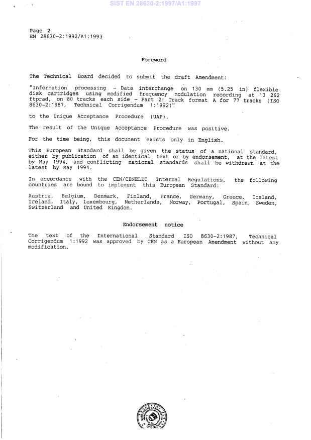 Information processing - Data interchange on 130 mm (5.25 in) flexible disk cartridges using modified frequency modulation recording at 13 262 ftprad, on 80 tracks each side - Part 2: Track format A for 77 tracks (ISO 8630-2:1987, Technical Corrigendum 1:1992)