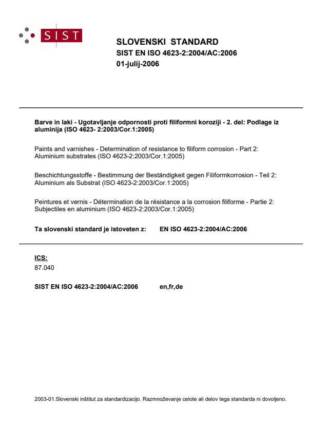 Barve in laki - Ugotavljanje odpornosti proti filiformni koroziji - 2. del: Podlage iz aluminija (ISO 4623- 2:2003/Cor.1:2005)