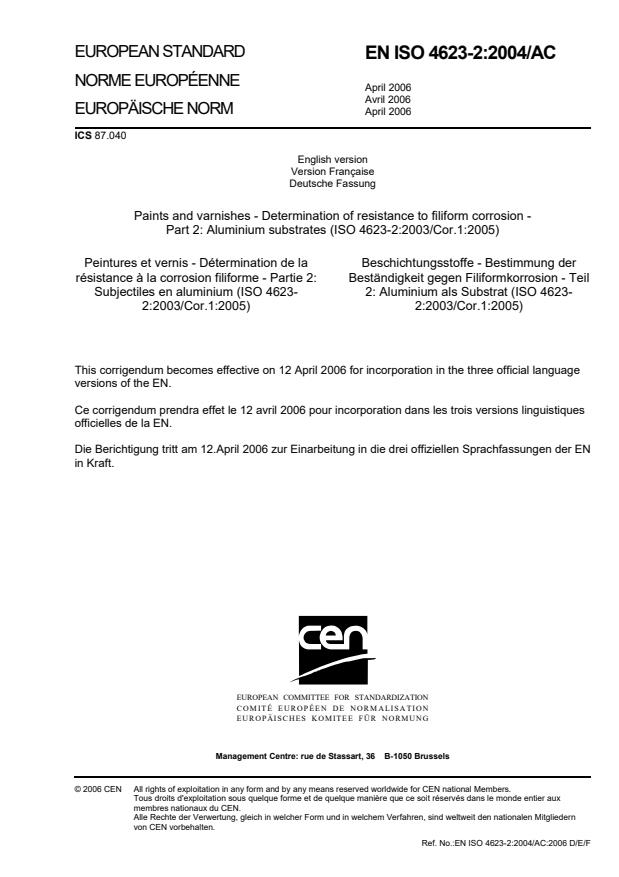 EN ISO 4623-2:2004/AC:2006 is a corrigendum published by the European Committee for Standardization (CEN). Its full title is "Paints and varnishes - Determination of resistance to filiform corrosion - Part 2: Aluminium substrates (ISO 4623-2:2003/Cor.1:2005)". This standard covers: ISO - Taking over of a ISO Technical Corrigendum