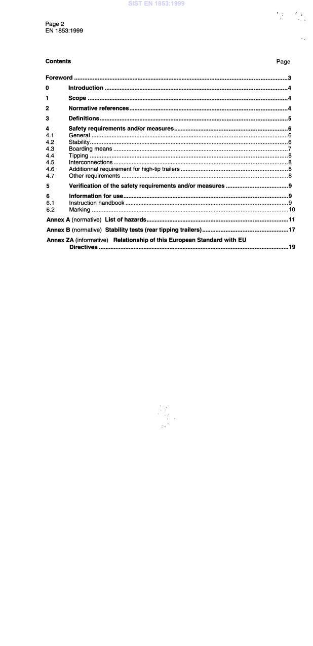 EN 1853:1999 is a standard published by the European Committee for Standardization (CEN). Its full title is "Agricultural machinery - Trailers with tipping body - Safety". This standard covers: This standard specifies specific safety requirements and their verification for the design and construction of agricultural trailers with a tipping body, balanced and semi mounted, where the term agricultural trailer refers to a vehicle used in agriculture only for transportation and which, through its design, is adapted and intended for towing by a tractor or a self-propelled agricultural machine. This standard is not applicable to trailers with a de-mountable body. NOTE: Braking requirements are not included in this standard. These will be studied during its revision depending on the development of European regulations. In addition, it specifies the type of information on safe working practices to be provided by the manufacturer. The list of significant hazards dealt with in this standard is given in annex A. Annex A also indicates the hazards which have not been dealt with. Environmental aspects have not been considered in this standard. This standard applies primarily to machines which are manufactured after the date of issue of the standard.