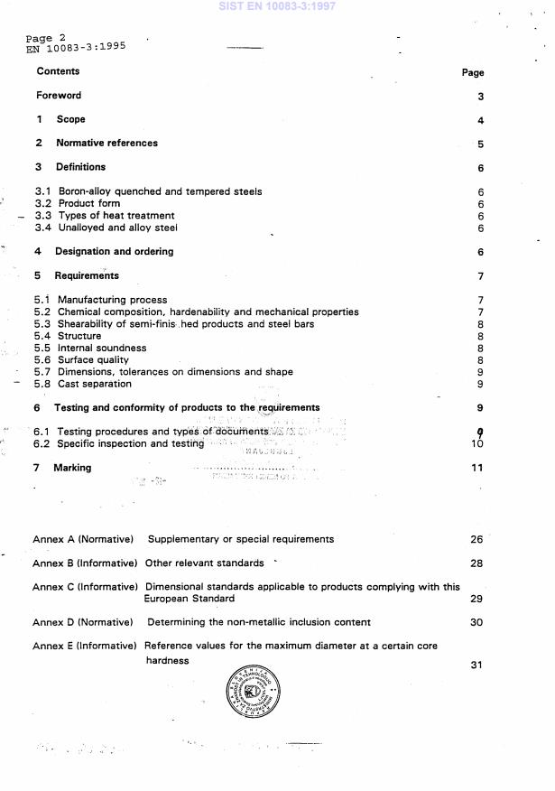EN 10083-3:1995 is a standard published by the European Committee for Standardization (CEN). Its full title is "Quenched and tempered steels - Part 3: Technical delivery conditions for boron steels". This standard covers: This European standard gives the technical delivery conditions for: - semi-finished products, hot formed, for example blooms, billets, slabs (see notes 3 and 4), - bars (see note 3), rod, wide flats, hot or cold-rolled sheet/ plate and strip, hammer and drop forgings (see note 3) manufactured from the boron-alloy quenched and tempered steels listed in table 3 (see note 5), and supplied in one of the heat treatment conditions given for the different types of products in table 1...