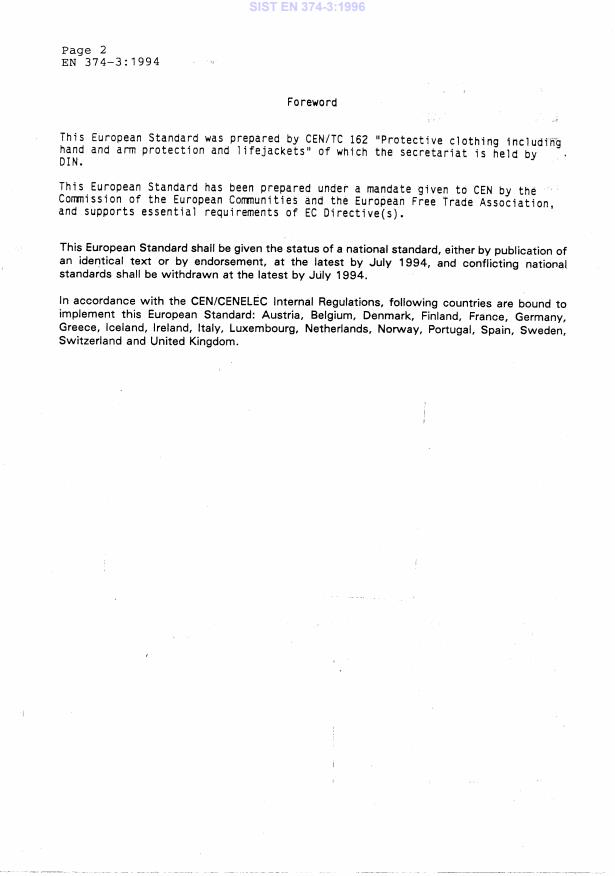 EN 374-3:1994 is associated with the following European legislation: EU Directives/Regulations: 89/686/EEC; Standardization Mandates: M/BC/CEN/88/8. When a standard is cited in the Official Journal of the European Union, products manufactured in conformity with it benefit from a presumption of conformity with the essential requirements of the corresponding EU directive or regulation.