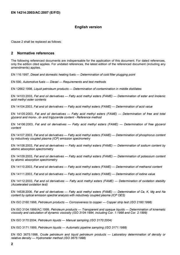 Version française L'article 2 de la norme doit être remplacé par le suivant : 2 Références normatives Les documents de référence suivants sont indispensables pour l'application du présent document. Pour les références datées, seule l'édition citée s'applique. Pour les références non datées, la dernière édition du document de référence s'applique (y compris les éventuels amendements). EN 116:1997, Combustibles pour moteurs diesel et pour installations de chauffage domestique — Détermination de la température limite de filtrabilité EN 590, Carburants pour automobiles — Combustible pour moteur diesel (gazole) — Exigences et méthodes d'essai EN 12662:1998, Produits pétroliers liquides — Détermination de la contamination des distillats moyens EN 14103:2003, Produits dérivés des corps gras — Esters méthyliques d’acides gras (EMAG) — Détermination de la teneur en ester et en ester méthylique de l’acide linolénique EN 14104:2003, Produits dérivés des corps gras — Esters méthyliques d’acides gras (EMAG) — Détermination de l’indice d’acide EN 14105:2003, Produits dérivés des corps gras — Esters méthyliques d’acides gras (EMAG) — Détermination de la teneur en glycérols libre et total et en mono-, di- et triglycérides — Méthode de référence EN 14106:2003, Produits dérivés des corps gras — Esters méthyliques d’acides gras (EMAG) — Détermination de la teneur en glycérol libre EN 14107:2003, Produits dérivés des corps gras — Esters méthyliques d’acides gras (EMAG) — Détermination de la teneur en phosphore par spectrométrie d’émission de plasma induit par haute fréquence (méthode ICP) EN 14108:2003, Produits dérivés des corps gras — Esters méthyliques d’acides gras (EMAG) — Détermination de la teneur en sodium par spectrométrie d’absorption atomique EN 14109:2003, Produits dérivés des corps gras — Esters méthyliques d’acides gras (EMAG) — Détermination de la teneur en potassium par spectrométrie d’absorption atomique EN 14110:2003, Produits dérivés des corps gras — Esters méthyliques d’acides gras (EMAG) — Détermination de la teneur en méthanol EN 14111:2003, Produits dérivés des corps gras — Esters méthyliques d’acides gras (EMAG) — Détermination de l’indice d’iode EN 14112:2003, Produits dérivés des corps gras — Esters méthyliques d’acides gras (EMAG) — Détermination de la stabilité à l’oxydation (essai d’oxydation accélérée) EN 14538:2006, Produits dérivés des corps gras — Esters méthyliques d’acides gras (EMAG) — Détermination de la teneur en Ca, K, Mg et Na par spectrométrie d’émission optique avec plasma à couplage inductif (ICP OES) EN ISO 2160:1998, Produits pétroliers — Action corrosive sur le cuivre — Essai à la lame de cuivre (ISO 2160:1998)