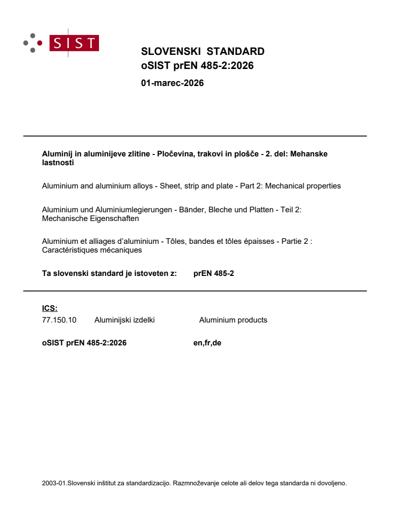 prEN 485-2 is a European draft standard developed by CEN (European Committee for Standardization) that specifies the mechanical properties of wrought aluminium and aluminium alloy sheet, strip, and plate intended for general engineering purposes. This standard ensures the quality and consistency of aluminium flat-rolled products and plays a critical role in materials selection for manufacturers and engineers across various industries.