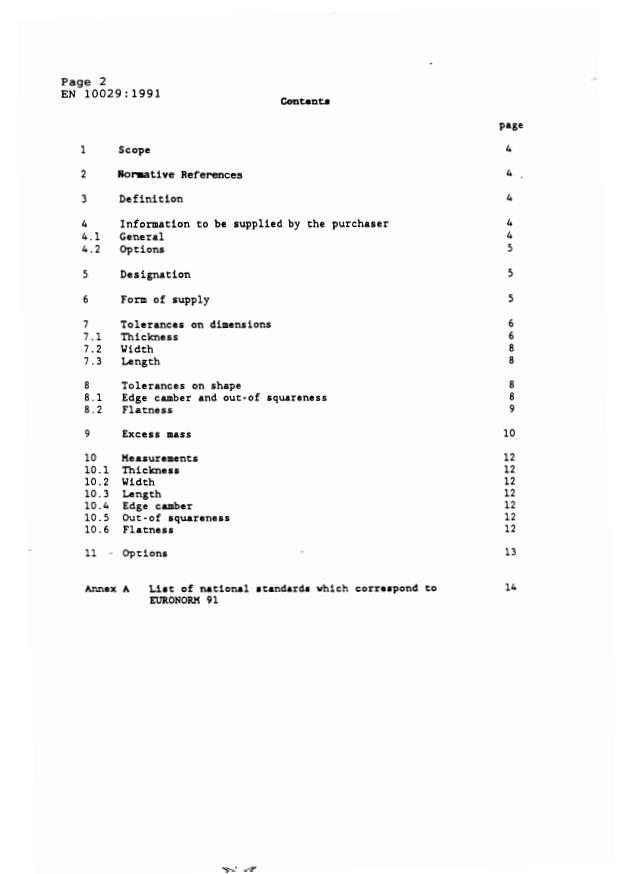 EN 10029:1991 is a standard published by the European Committee for Standardization (CEN). Its full title is "Hot rolled steel plates 3 mm thick or above - Tolerances on dimensions, shape and mass". This standard covers: This European Standard specifies requirements for tolerances for hot rolled non-alloy and alloy steel plates including stainless steels, with the following characteristics: a) nominal thickness >= 3mm <=250 mm; b) nominal width >= 600 mm ; c) specified minimum yield strength > 700 N/mm2. Tolerances for products of width < 600 mm cut or slit from plate should be agreed between manufacturer and purchaser at the time of enquiry and order.