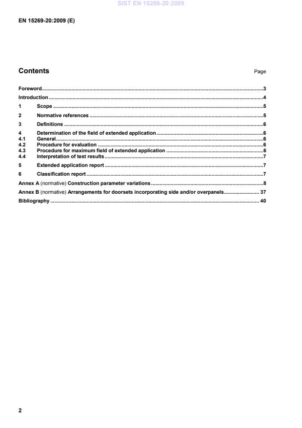 4.4.2 Where a series of tests have been conducted, the field of extended application shall be based on the lowest performance achieved from the complete series of tests unless excessive leakage has been attributed to one or more specific construction parameter variation. 4.4.3 Where it has been possible, to identify leakage due to a specific parameter, the extended application for all other construction parameter variations can be based on the performance achieved after isolating the parameter with excessive leakage. 5 Extended application report Prepare an extended application report in accordance with the requirements of Clause 6 of prEN 15269-1:2009, based on the results of evaluations in accordance with the above. 6 Classification report The classification report shall be determined from the results of the extended application report and shall be presented in accordance with Annex A of EN 13501-2:2007. SIST EN 15269-20:2009