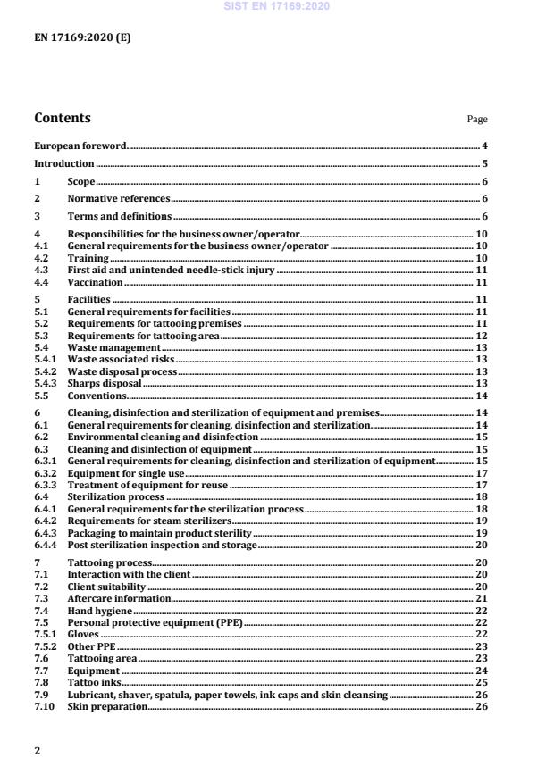 EN 17169:2020 - "Tattooing - Safe and hygienic practice" is a European Standard published by CEN that defines hygiene and safety requirements for tattoo services. The standard covers hygiene measures before, during and after tattooing, guidance for tattooists’ interactions with clients and authorities, and procedures to protect clients, practitioners and others in the tattoo work area. EN 17169 is intended to reduce infection risk and promote consistent, safe tattoo practice across tattoo studios, conventions and temporary events.