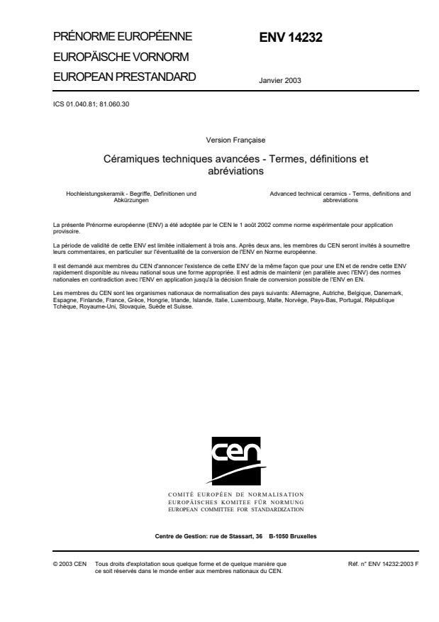 ENV 14232:2003 is a standardization document published by the European Committee for Standardization (CEN). Its full title is "Advanced technical ceramics - Terms, definitions and abbreviations". This standard covers: This European Prestandard is a vocabulary which provides a list of terms and associated definitions which are typically used for advanced technical ceramic materials, products, applications, properties and processes. The document contains, in separate lists, those abbreviations which have found general acceptance in scientific and technical literature; they are given together with the corresponding terms and definitions or descriptions. NOTE 1 This prestandard does not include terms which, though used in the field of advanced technical ceramics, are of a more general nature and are also well known in other fields of technology. NOTE 2 A list of some European Standards, European Prestandards and Draft European Standards of CEN Technical Committee 184 "Advanced technical ceramics" containing terms defined in this European Prestandard, is given in the Bibliography.