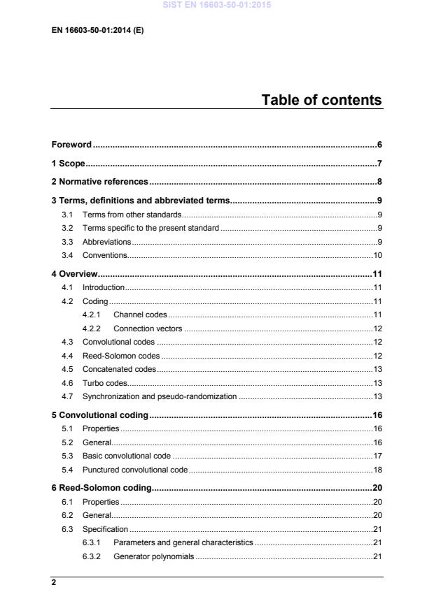 Figures Figure 3-1: Bit numbering convention . 10 Figure 4-1: Coding, randomization and synchronization (1) . 14 Figure 4-2: Coding, randomization and synchronization (2) . 15 Figure 5-1: Convolutional encoder block diagram . 18 Figure 5-2: Punctured encoder block diagram . 19 Figure 6-1: Functional representation of R-S interleaving . 23 Figure 6-2: Reed-Solomon codeblock partitioning . 24 Figure 7-1: Interpretation of permutation . 31 Figure 7-2: Turbo encoder block diagram . 32 Figure 7-3: Turbo codeblocks for code rates 1/2 and 1/4 . 34 Figure 7-4: Turbo codeblock with attached sync marker . 34 Figure 8-1: Format of channel access data unit (CADU) . 35 Figure 8-2 ASM bit pattern for non-turbo-coded data . 36 Figure 8-3: ASM bit pattern for rate 1/2 turbo-coded data . 36 Figure 8-4: ASM bit pattern for rate 1/4 turbo-coded data . 37 Figure 8-5: Embedded ASM bit pattern . 38 SIST EN 16603-50-01:2015