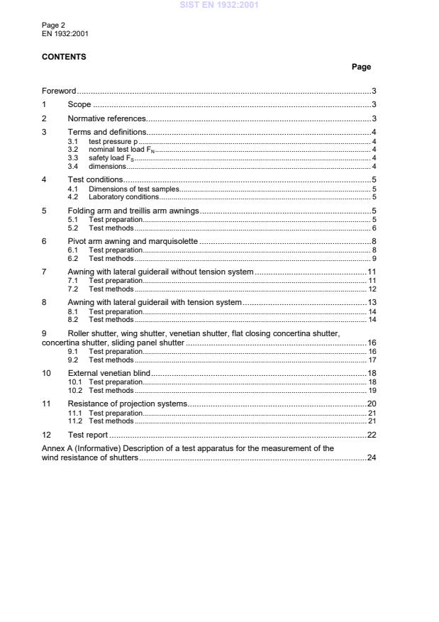 Page 2EN 1932:2001CONTENTSPageForeword.31Scope.32Normative references.33Terms and definitions.43.1test pressure p.43.2nominal test load FN.43.3safety load FS.43.4dimensions.44Test conditions.54.1Dimensions of test samples.54.2Laboratory conditions.55Folding arm and treillis arm awnings.55.1Test preparation.55.2Test methods.66Pivot arm awning and marquisolette.86.1Test preparation.86.2Test methods.97Awning with lateral guiderail without tension system.117.1Test preparation.117.2Test methods.128Awning with lateral guiderail with tension system.138.1Test preparation.148.2Test methods.149Roller shutter, wing shutter, venetian shutter, flat closing concertina shutter,concertina shutter, sliding panel shutter.169.1Test preparation.169.2Test methods.1710External venetian blind.1810.1Test preparation.1810.2Test methods.1911Resistance of projection systems.2011.1Test preparation.2111.2Test methods.2112Test report.22Annex A (Informative) Description of a test apparatus for the measurement of thewind resistance of shutters.24SIST EN 1932:2001
