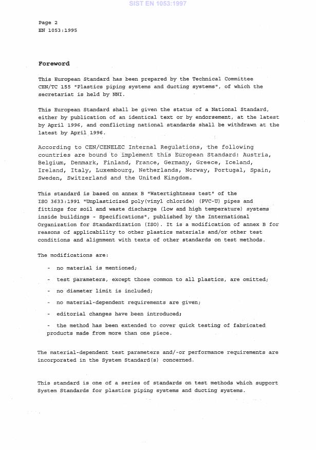 EN 1053:1995 is a standard published by the European Committee for Standardization (CEN). Its full title is "Plastics piping systems - Thermoplastics piping systems for non-pressure applications - Test method for watertightness". This standard covers: This Standard specifies a test method for watertightness of a) joints of thermoplastics piping systems for non-pressure applications; b) thermoplastics fabricated products made from more than one piece for non-pressure applications.