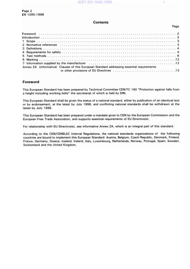 EN 1095:1998 is a standard published by the European Committee for Standardization (CEN). Its full title is "Deck safety harness and safety line for use on recreational craft - Safety requirements and test methods". This standard covers: This standard specifies the requirements for performance, sizing, marking and test methods for deck safety harnesses and safety lines. This European Standard is applicable to harnesses and lines in the following sizes of body weight: size 1 > 50 kg1) size 2 > 20 kg ? 50 kg1) size 3 ? 20 kg1) which are intended to be worn by all persons when in the exposed cockpit or on the working deck of a recreational vessel afloat. It is not applicable to dinghy "trapeze" harnesses, windsurfing harnesses, or seat harnesses for fast motor boats.