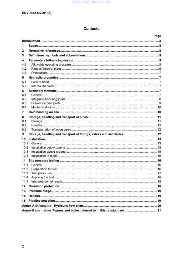 This European prestandard gives recommended practices for installation of unplasticized poly(vinyl chloride) (PVC-U) pipes, fittings, valves and ancillaries when used in piping systems conveying water under pressure. The recommendations are intended to give practical guidance for the best methods of design and installation of piping systems incorporating pipes, fittings, valves and ancillary equipment made from PVC-U materials and used for the following purposes: a) water mains and services buried in ground; b) conveyance of water above ground for both outside and inside buildings, for the supply of water under pressure at approximately 20 °C (cold water) intended for human consumption and for general purposes. This prestandard is also applicable to components for the conveyance of water up to and including 45 °C. For temperatures between 25 °C and 45 °C Figure A.1 of EN 1452-2:1999 applies. In addition, recommendations are given for the connection to fittings, valves and ancillary equipment made from materials other than PVC-U.