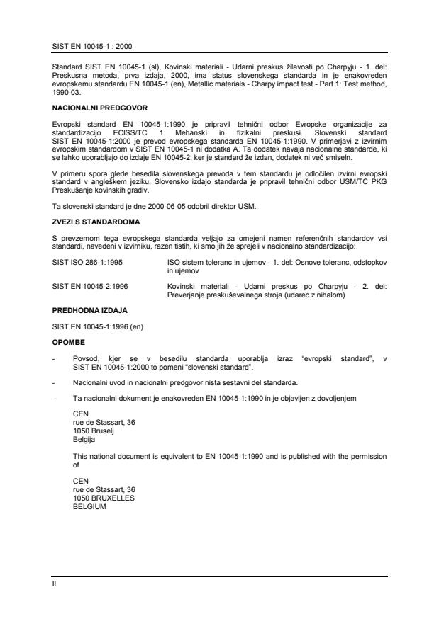 SIST EN 10045-1:2000 je prevod evropskega standarda EN 10045-1:1990. V primerjavi z izvirnim