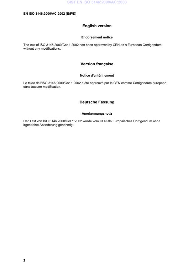 EN ISO 3146:2000/AC:2002 has the following relationships with other standards: It is inter standard links to EN ISO 3146:2022, EN ISO 3146:2000/AC:2003, EN ISO 3146:2000. Understanding these relationships helps ensure you are using the most current and applicable version of the standard.