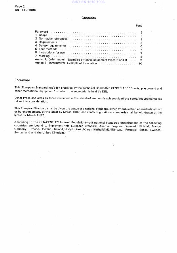 EN 1510:1996 is a standard published by the European Committee for Standardization (CEN). Its full title is "Playing field equipment - Tennis equipment - Functional and safety requirements, test methods". This standard covers: This European Standard specifies the functional requirements and the safety requirements of tennis equipment, excluding rackets and balls. This European Standard is applicable to 3 types of tennis equipment which are used indoors and outdoors.