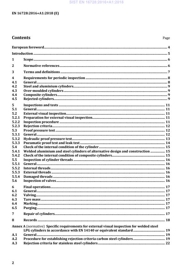 Specific requirements for external visual inspection for welded steel LPG cylinders in accordance with EN 14140 or equivalent standard . 19 A.1 General . 19 A.2 Procedure for establishing rejection criteria carbon steel cylinders . 19 A.3 Rejection criteria for stainless steel cylinders . 22 SIST EN 16728:2016+A1:2018