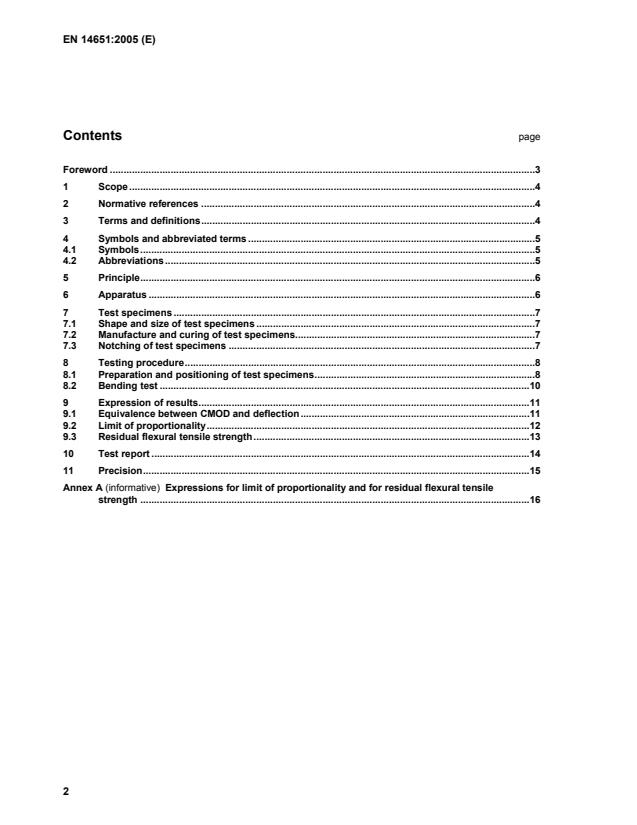 ML bending moment corresponding to the load at LOP b width of test specimen fR,j residual flexural tensile strength, j = 1, 2, 3 or 4 fct,Lf LOP hsp distance between the tip of the notch and the top of the test specimen in the mid-span section l length of span x width of notch y distance between bottom of test specimen and axis of displacement transducer δ deflection δFL deflection at LOP δj deflection value, j = 1, 2, 3 or 4 4.2 Abbreviations CMOD crack mouth opening displacement LOP limit of proportionality