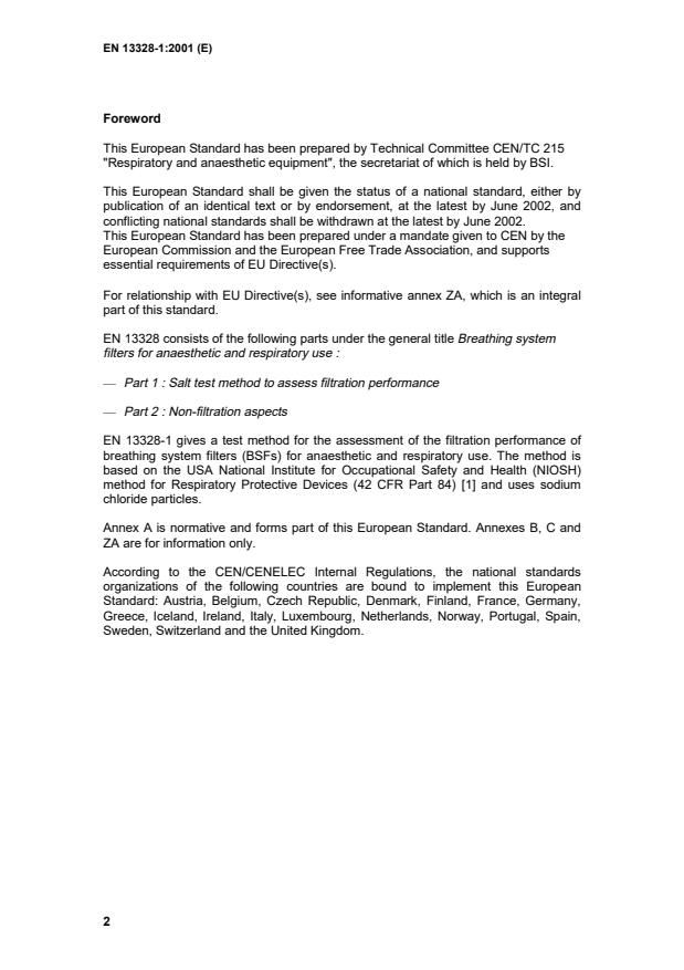 EN 13328-1:2001 is a standard published by the European Committee for Standardization (CEN). Its full title is "Breathing system filters for anaesthetic and respiratory use - Part 1: Salt test method to assess filtration performance". This standard covers: This part of this European Standard establishes a short-term airborne sodium chloride particle challenge test method for assessing the filtration performance of breathing system filters (BSFs) intended for the filtration of respired gases in humans. The test method is intended for BSFs used with a clinical breathing system. It is not intended for other types of filter e.g. those designed to protect vacuum sources or gas sample lines, to filter compressed gases, to protect test equipment or for physiological respiratory measurements. NOTE Non-filtration aspects of BSFs are addressed in prEN 13328-2.