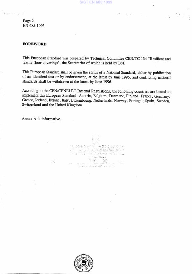 EN 685:1995 is a standard published by the European Committee for Standardization (CEN). Its full title is "Resilient floor coverings - Classification". This standard covers: This European Standard establishes a classification system for resilient floor coverings. The use of this classification of premises is strongly linked to the requirements specified in the European Standard for each type of resilient floor covering. This standard is also intended to give guidance to manufacturers, specifiers and consumers to enable them to choose the appropriate class of resilient floor covering for any given area of use or specific room. The guidance is based on practical requirements for areas of use and intensity of use.