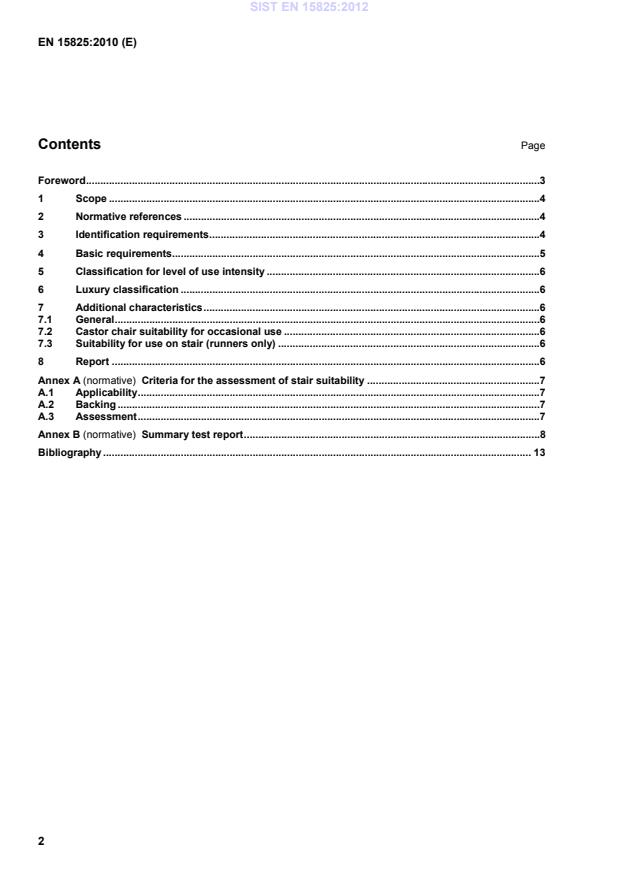 Ta evropski standard določa zahteve za strojno izdelane nelasaste preproge in tekače, vključno z razvrščanjem za domačo uporabo glede na intenzivnost uporabe in luksuz. Ta evropski standard ne velja za ročno vozlane preproge, predpražnike in kopalnične preproge.
