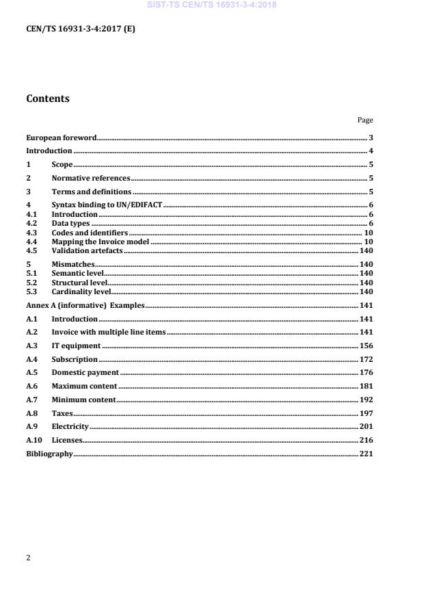 Ta tehnična specifikacija CEN (TS) vsebuje preslikavo med semantičnim podatkovnim modelom elektronskega računa (EN 16931-1) in naslednjo sintakso: UN/EDIFACT INVOIC D16B. Za vsak element semantičnega modela (vključno s podelementi ali dodatnimi komponentami, kot so oznake elementov kodnega seznama) je opredeljen element sintakse, ki vsebuje informacije določenega elementa semantičnega modela. Kakršnakoli neskladja med semantiko, formatom, kardinalnostjo ali strukturo so navedena. Vsa pravila, ki jih je treba upoštevati pri uporabi posamezne sintakse, so neformalno navedena v tej tehnični specifikaciji. Skupaj s to tehnično specifikacijo je objavljen sklop artefaktov za potrjevanje, vključno s formalizacijo pravil.