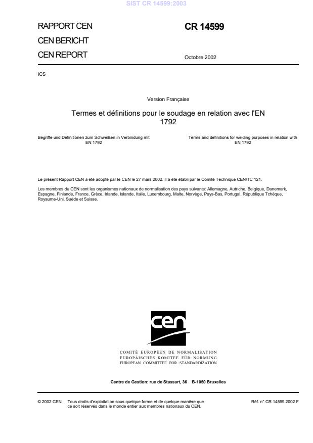 CR 14599:2002 is a standardization document published by the European Committee for Standardization (CEN). Its full title is "Terms and definitions for welding purposes in relation with EN 1792". This standard covers: This standard constitutes a compilation of technical terms and definitions specifically related to welding and allied processes.