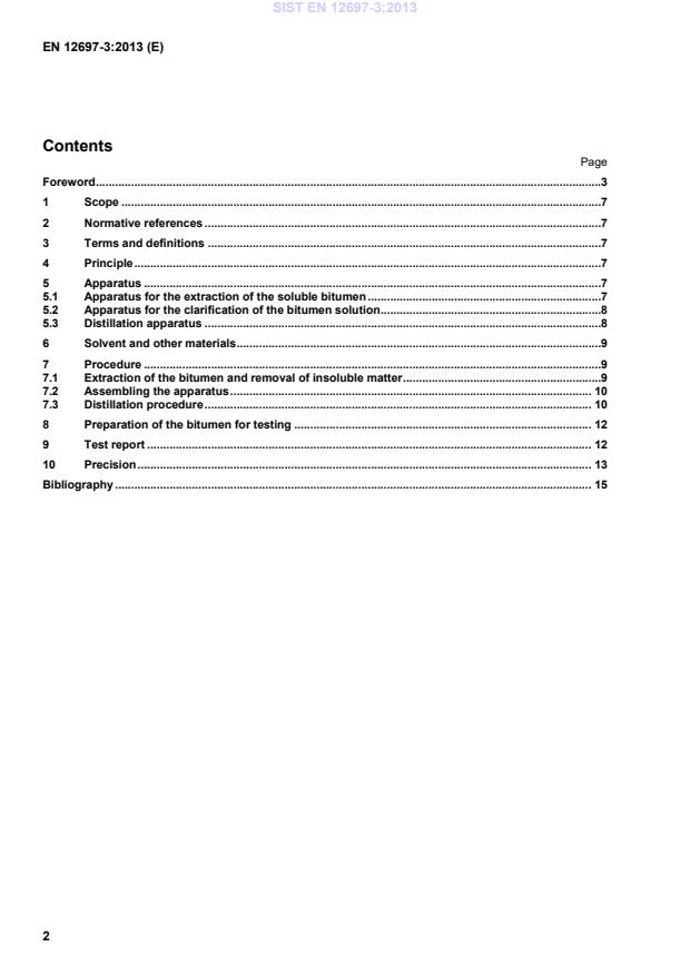 Page Foreword .3 1 Scope .7 2 Normative references .7 3 Terms and definitions .7 4 Principle .7 5 Apparatus .7 5.1 Apparatus for the extraction of the soluble bitumen .7 5.2 Apparatus for the clarification of the bitumen solution.8 5.3 Distillation apparatus .8 6 Solvent and other materials .9 7 Procedure .9 7.1 Extraction of the bitumen and removal of insoluble matter .9 7.2 Assembling the apparatus . 10 7.3 Distillation procedure . 10 8 Preparation of the bitumen for testing . 12 9 Test report . 12 10 Precision . 13 Bibliography . 15