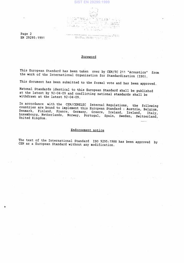 IS0 9295 : 1988 (El Foreword IS0 (the International Organization for Standardization) is a worldwide federation of national standards bodies (IS0 member bodies). The work of preparing International Standards is normally carried out through IS0 technical committees. Each member body interested in a subject for which a technical committee has been established has the right to be represented on that committee. International organizations, govern- mental and non-governmental, in liaison with ISO, also take part in the work. IS0 collaborates closely with the International Electrotechnical Commission (IEC) on all matters of electrotechnical standardization. Draft International Standards adopted by the technical committees are circulated to the member bodies for approval before their acceptance as International Standards by the IS0 Council. They are approved in accordance with IS0 procedures requiring at least 75 % approval by the member bodies voting. International Standard IS0 9295 was prepared by the European Computer Manufac- turers Association (as Standard ECMA-108) and was adopted, under a special “fast- track procedure”, by Technical Committee ISO/TC 43, Acoustics, in parallel with its approval by the IS0 member bodies. Users should note that all International Standards undergo revision from time to time and that any reference made herein to any other International Standard implies its latest edition, unless otherwise stated. 0 International Organization for Standardization, 1988 l Printed in Switzerland SIST EN 29295:1999