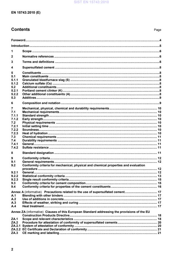 Clauses of this European Standard addressing the provisions of the EU Construction Products Directive . 18ZA.1Scope and relevant characteristics . 18ZA.2Procedure for attestation of conformity of supersulfated cements . 20ZA.2.1System of attestation of conformity . 20ZA.2.2EC Certificate and Declaration of conformity . 21ZA.3CE marking and labelling . 21SIST EN 15743:2010
