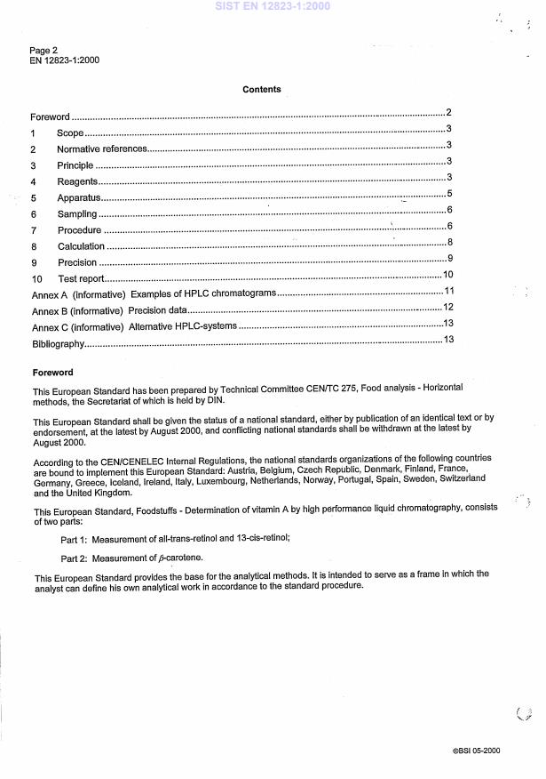 EN 12823-1:2000 is a standard published by the European Committee for Standardization (CEN). Its full title is "Foodstuffs - Determination of vitamin A by high performance liquid chromatography - Part 1: Measurements of all-trans-retinol and 13-cis-retinol". This standard covers: This European Standard specifies a method for the determination of vitamin A in foodstuffs by high performance liquid chromatography (HPLC). The determination of vitamin A content is carried out by the measurement of all- trans-retinol, 13-cis-retinol, and beta-carotene. This part covers the measurement of all-trans-retinol and 13-cis-retinol. The extract obtained after saponification in this method can be used for the determination of beta- carotene, as described in prEN 12823-2:1999 "Measurement of beta-carotene".